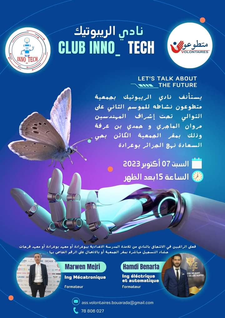 سينطلق نشاط نادي الروبوتيك » INNO_TECH » لجمعية متطوعون بوعرادة يوم السبت القادم 07 اكتوبر 2023 بداية من الساعة 15 بعد الزوال بمقر جمعية متطوعون الكائنLire la suite »قريبا… استئناف نشاط نادي الروبوتيك لجمعية متطوعون بوعرادة