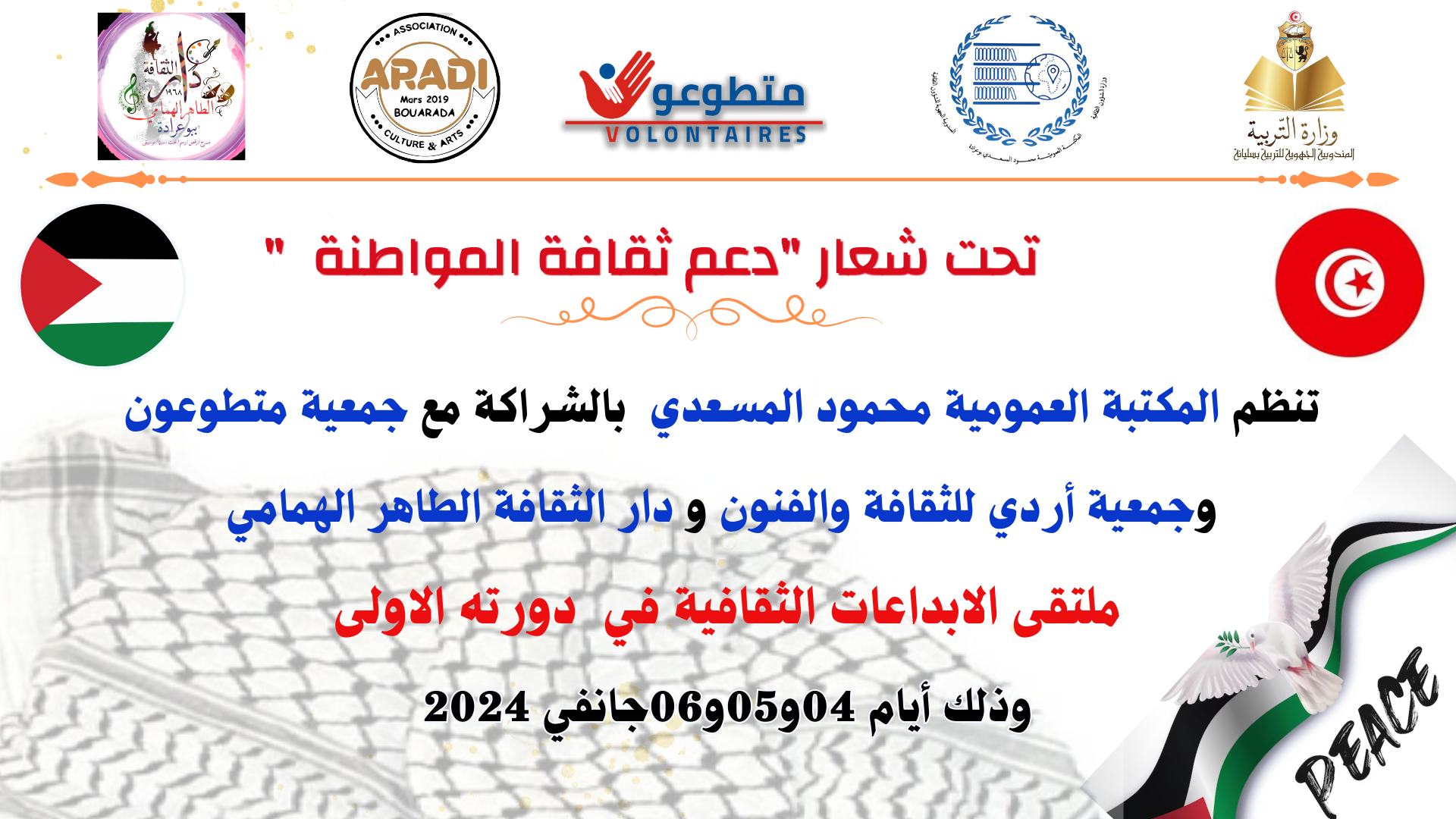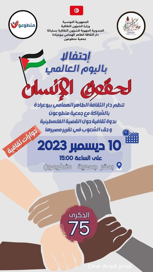 تحت شعار « دعم ثقافة المقاومة »تنظم المكتبة العمومية محمود المسعدي بالشراكة مع جمعية متطوعون وجمعية أردي للقافة والفنون تظاهرة ثقافية تحت عنوان « ملتقى الابداعات الثقافية ببوعرادة »وذلكLire la suite »تظاهرة ثقافية تحت عنوان « ملتقى الابداعات الثقافية ببوعرادة »وذلك أيام 04و05و06جانفي 2024 .